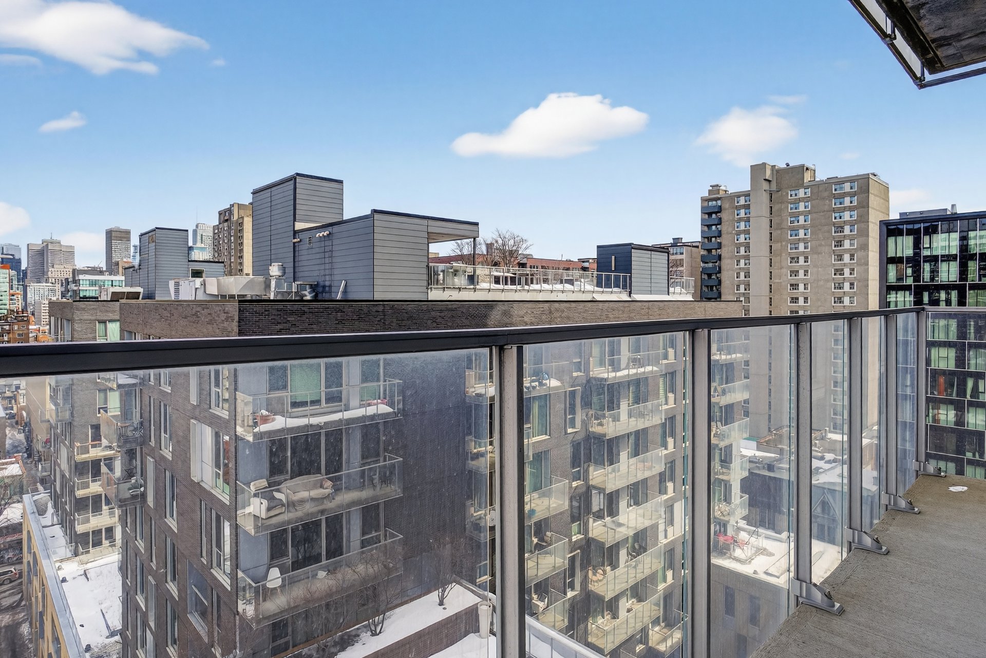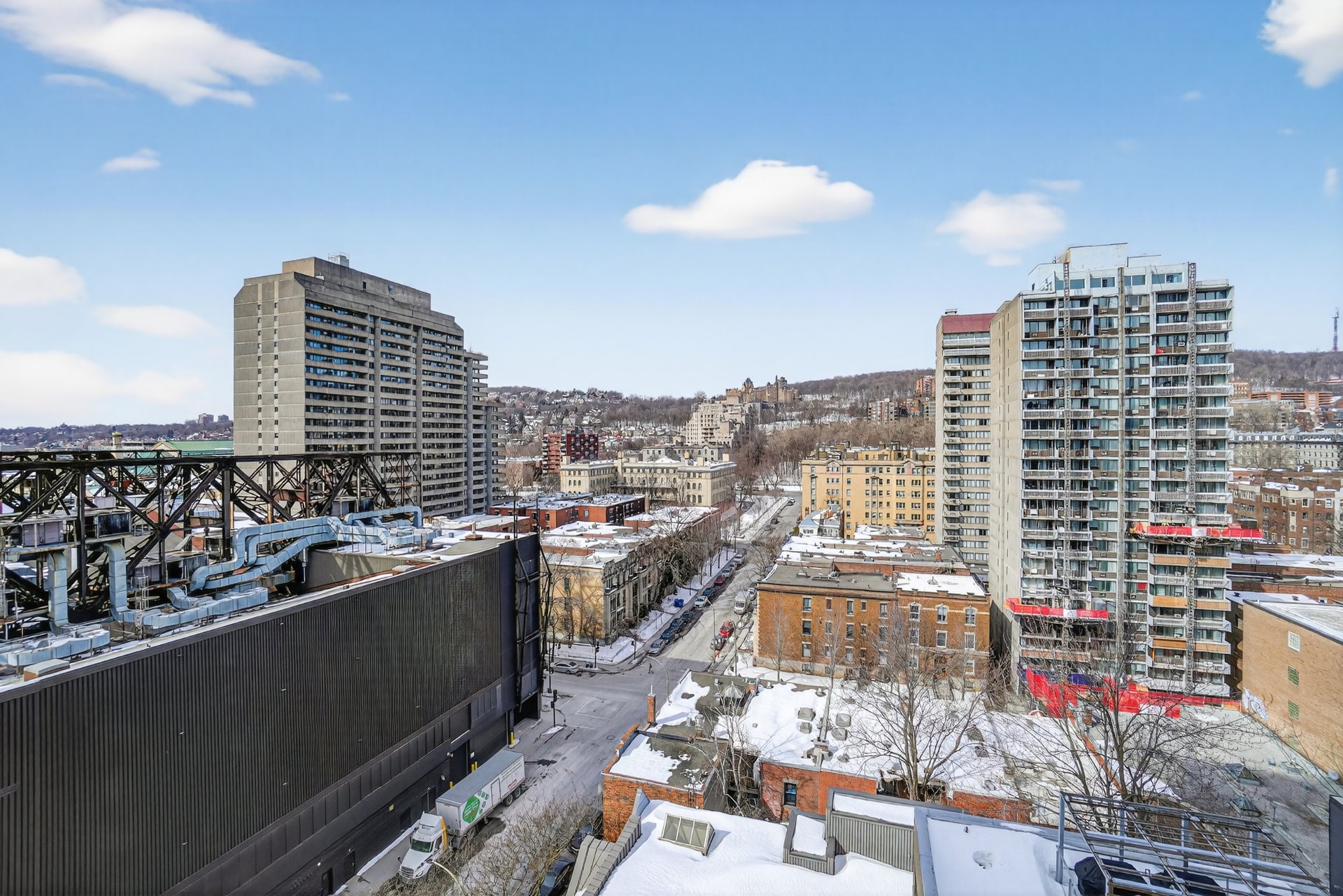 Seville: Condo unité de coin avec belle vue dégagée au 12e étage, plancher de bois, cuisine et salle de bain moderne, une chambre à coucher avec walk-in. Balcon, cagibi de rangement, Piscine et terrasse sur le toit, Gym et lounge, construction 2013, situé à deux pas du métro Atwater.